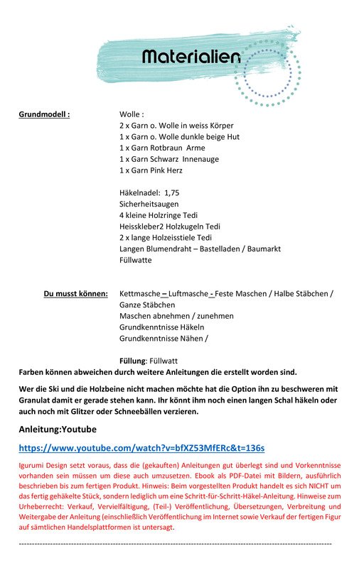 Hinweise zum Urheberrecht: Verkauf, Vervielfältigung, (Teil-) Veröffentlichung, Übersetzungen, Verbreitung und Weitergabe der Anleitung (einschließlich Veröffentlichung im Internet sowie Verkauf der fertigen Figur sowie Clothes Häkelanleitungen auf sämtlichen Handelsplattformen ist untersagt. Bitte bei veröffentlichung des Werkes Namensbekanntgabe des Designers