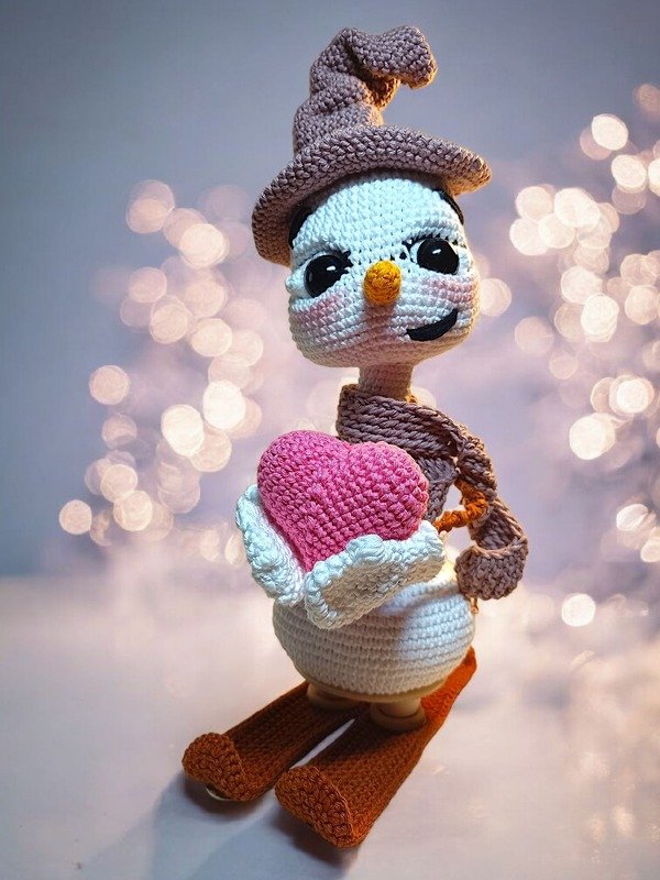 Er steht auf seine Skier mit seinem Herzchen in der Hand. Wenn ihr die Skier nicht machen wollt gibt es die Option den Schneemann mit Granulat zu füllen, damit er gut stehen kann. Er hat eine stattliche Größe von 36 cm und kann als Dekoration oder als Geschenk verwendet werden.