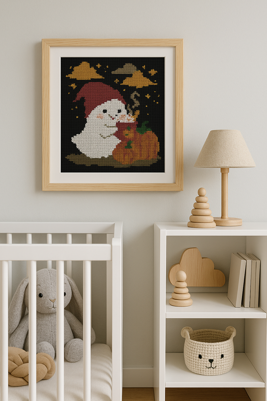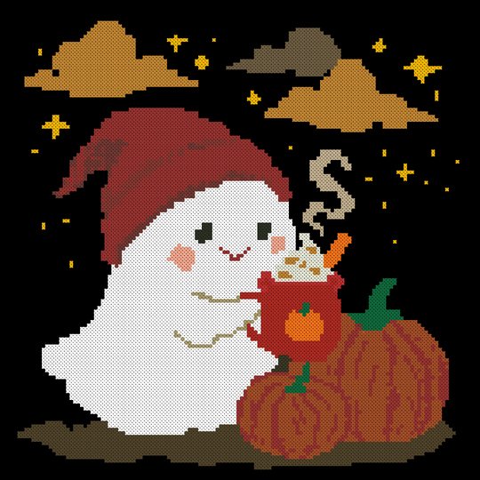 Bring a touch of cozy Halloween magic into your home with this adorable Ghost on Pumpkin Cross Stitch Pattern!