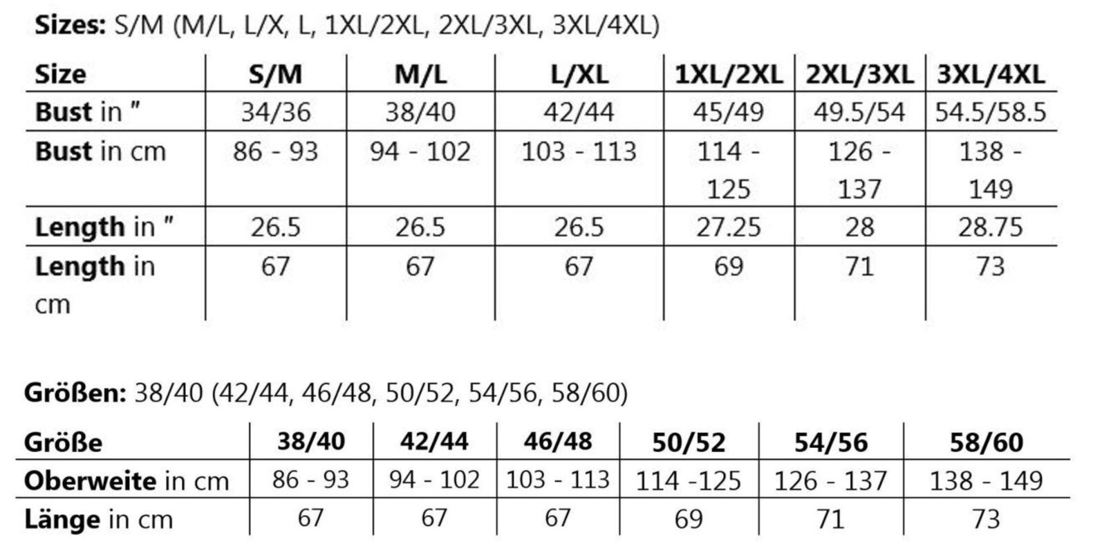 S/M (M/L, L/X, L, 1XL/2XL, 2XL/3XL, 3XL/4XL)