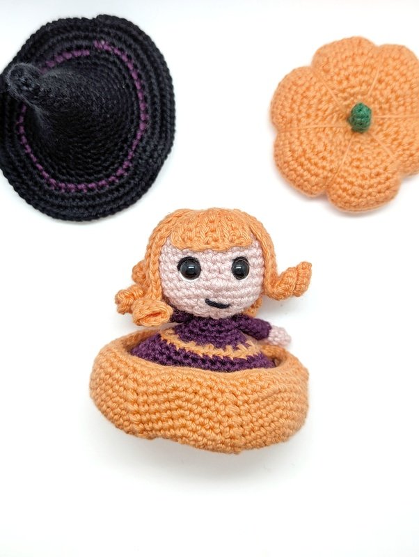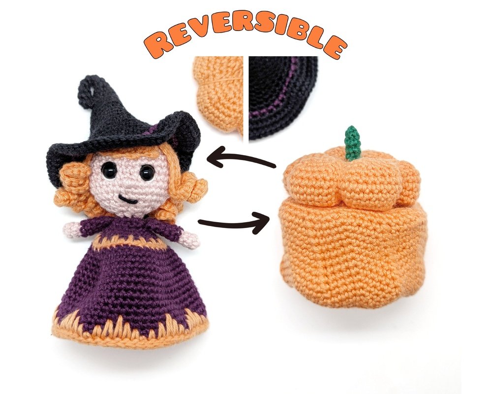 The reversible pumpkin with reaches a total size of 12 cm (as a witch) or down to 8 cm (as a pumpkin).