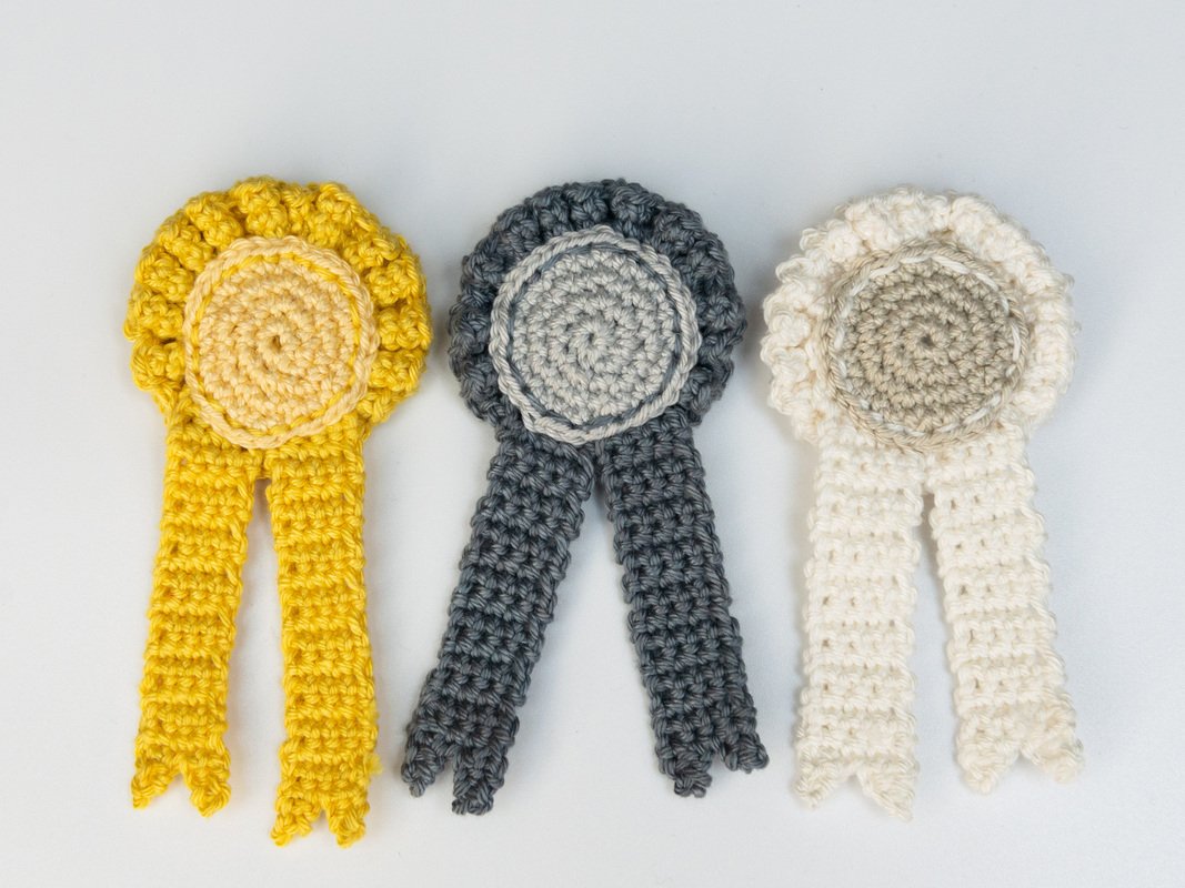 For the rosette, a top and a bottom part are needed, as well as two ribbon bows, which are sewn between the top and bottom parts. Finally, the brooch pin is sewn to the back of the rosette. Of course, all steps are described in detail in the crochet pattern and a variety of pictures clarify the individual steps.