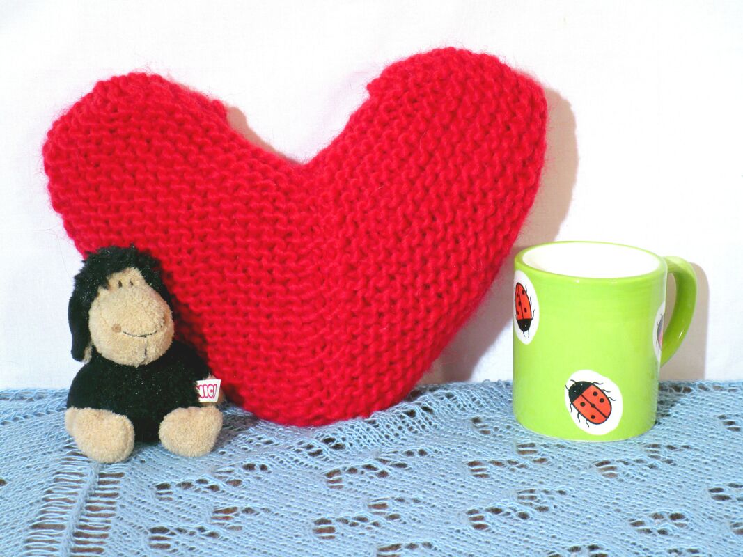 Heartshaped pillow „With Love“, to give away or just to cuddle yourself. The pillow is knit in one piece, the shape is produced by special increases and decreases that are explained in detail. So it hardly needs any sewing, merely the small section that is left open to allow you to insert the filling and this is easily closed.