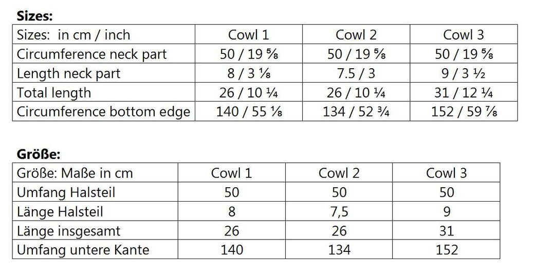 The repeat in the neck part of the cowl is only 4 stitches. Thus, you can adjust the cowl to any size and any yarn. How to adjust it as well as examples for calculations are at the end of this pattern.