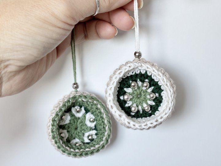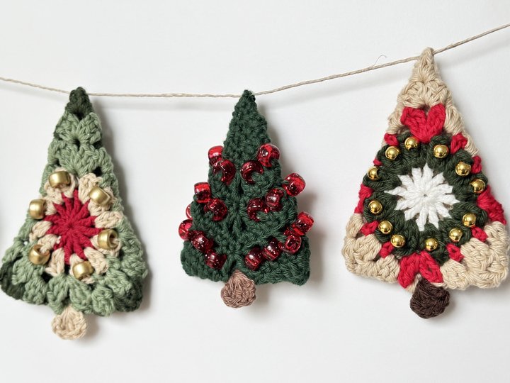 This downloadable PDF crochet pattern bundle includes detailed step-by-step instructions for creating granny square Christmas trees and sparkling crochet Christmas baubles with beads. The beads are delicately crocheted into the design, adding a touch of festive shimmer to your handmade Christmas decorations.