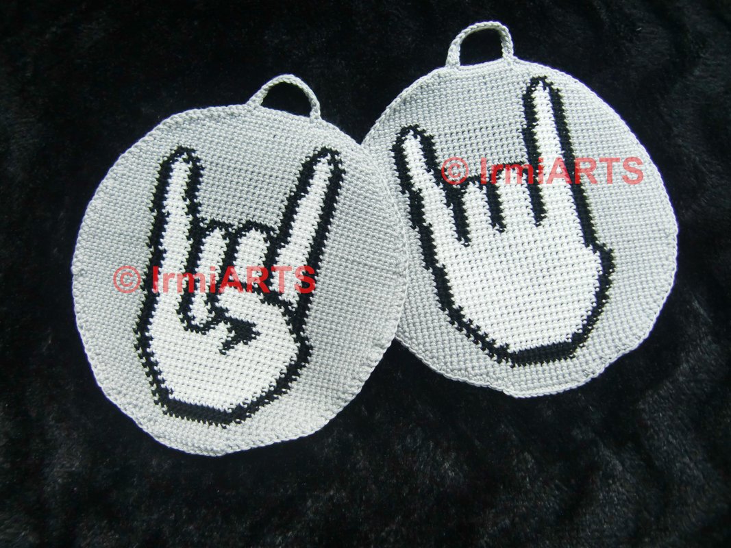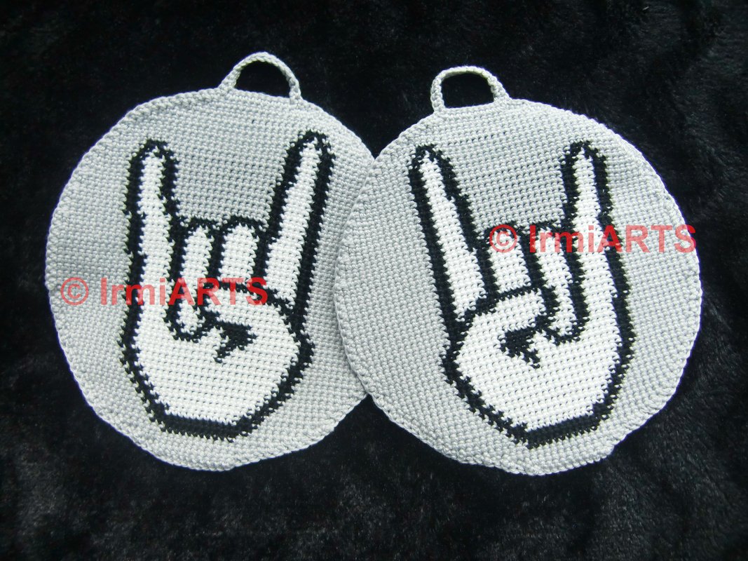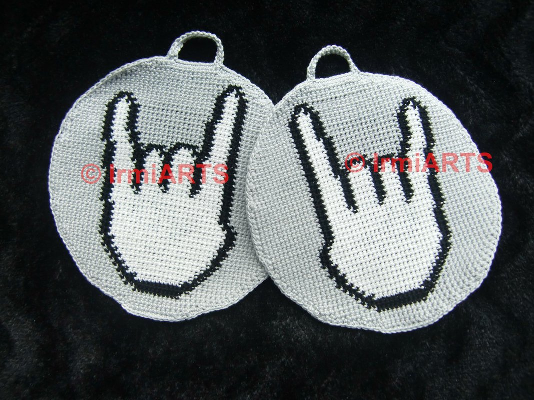 Cook like a true rocker! These double-faced crocheted pot holders are more than just practical kitchen aids — they make a statement! \m/