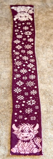 Using a 3mm circular knitting needle, I knitted a yarn that yielded a 10 x 10 cm swatch of 26 stitches x 35 rows. This made the scarf about 16 cm (6,3 inch) wide and 140 cm (55,1 inch) long.