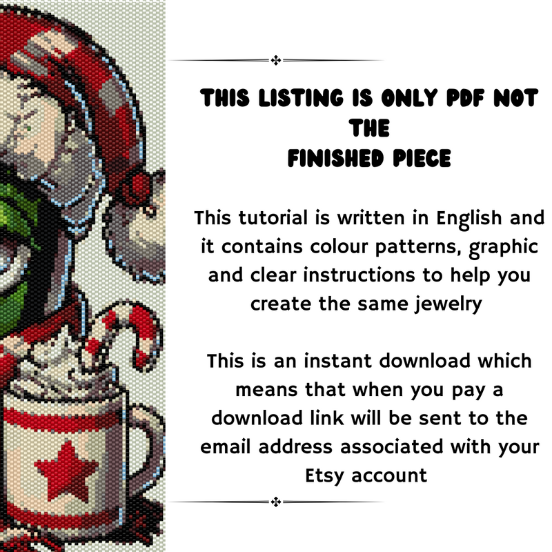 This file contains 2 PDFs, an even count peyote stitch pattern and a loom stitch peyote stitch pattern. Each pattern contains a colour chart, a word chart and a bead legend.