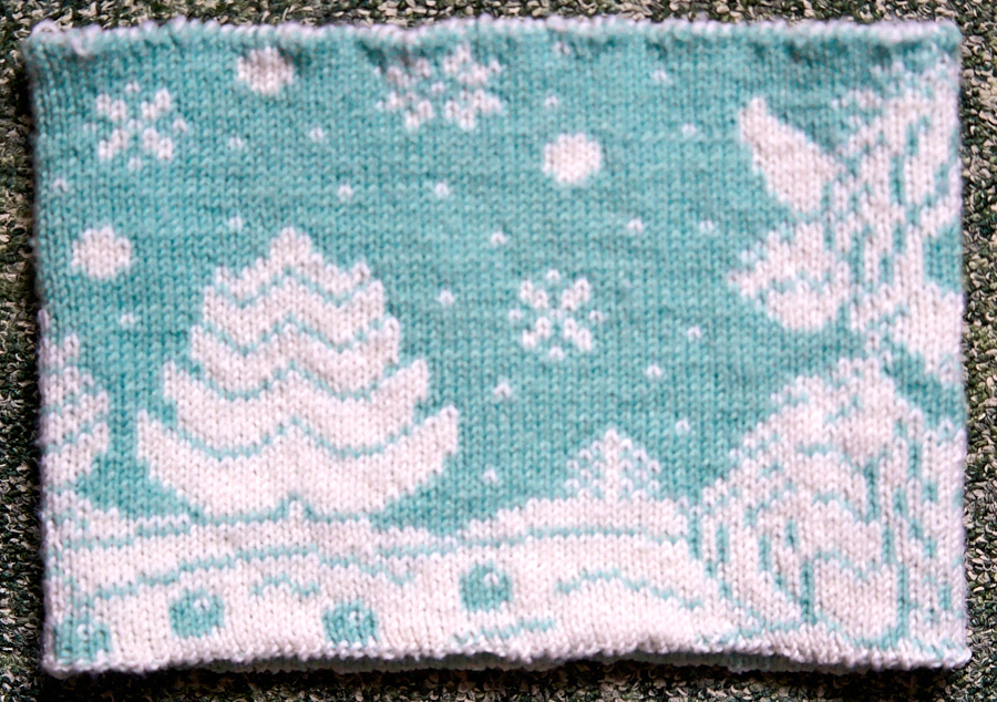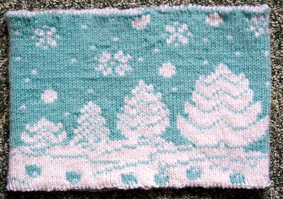 Using a 3mm circular knitting needle (80cm), I knitted with a yarn that yields a gauge of 28 stitches x 36 rows per 10 x 10 cm. With this yarn, the scarf, measured simply, is approximately 24.5 cm wide (circumference: 49 cm) and 17 cm high. The height can be adjusted by repeating the first and last rows.