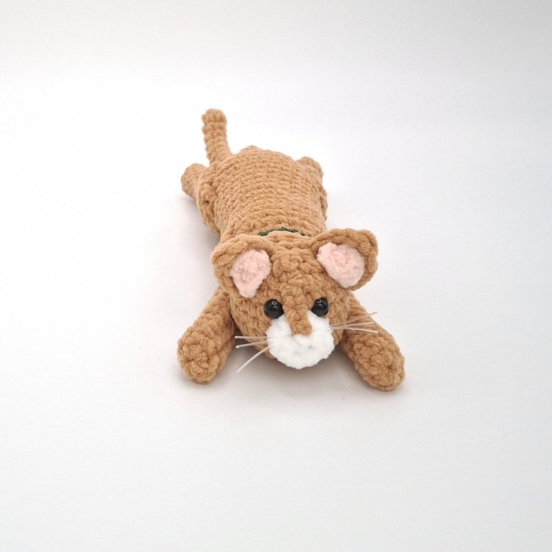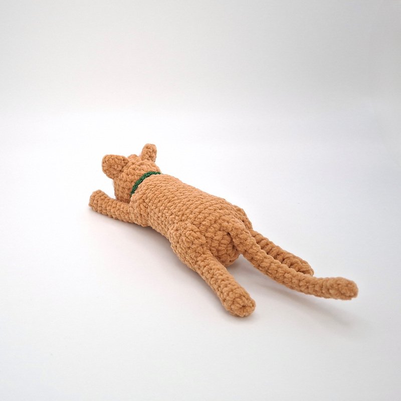 Using a velvet yarn 50g/130m and a 2,5mm-crochet hook, the cat will be about 5 cm tall and 19 cm long.
