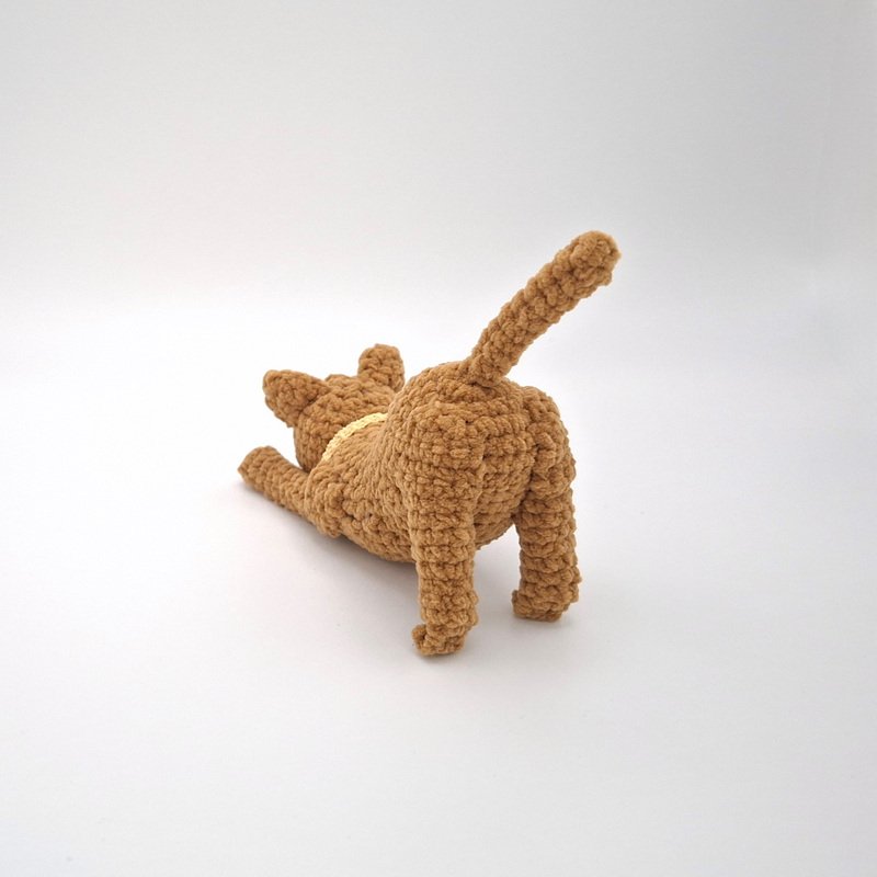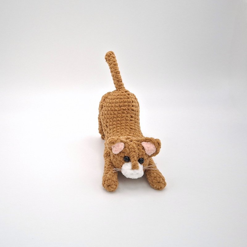 Using a velvet yarn 50g/130m and a 2,5mm-crochet hook, the cat will be about 12 cm tall and 12 cm long.