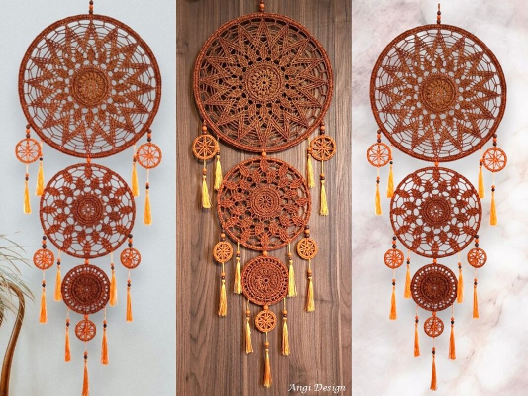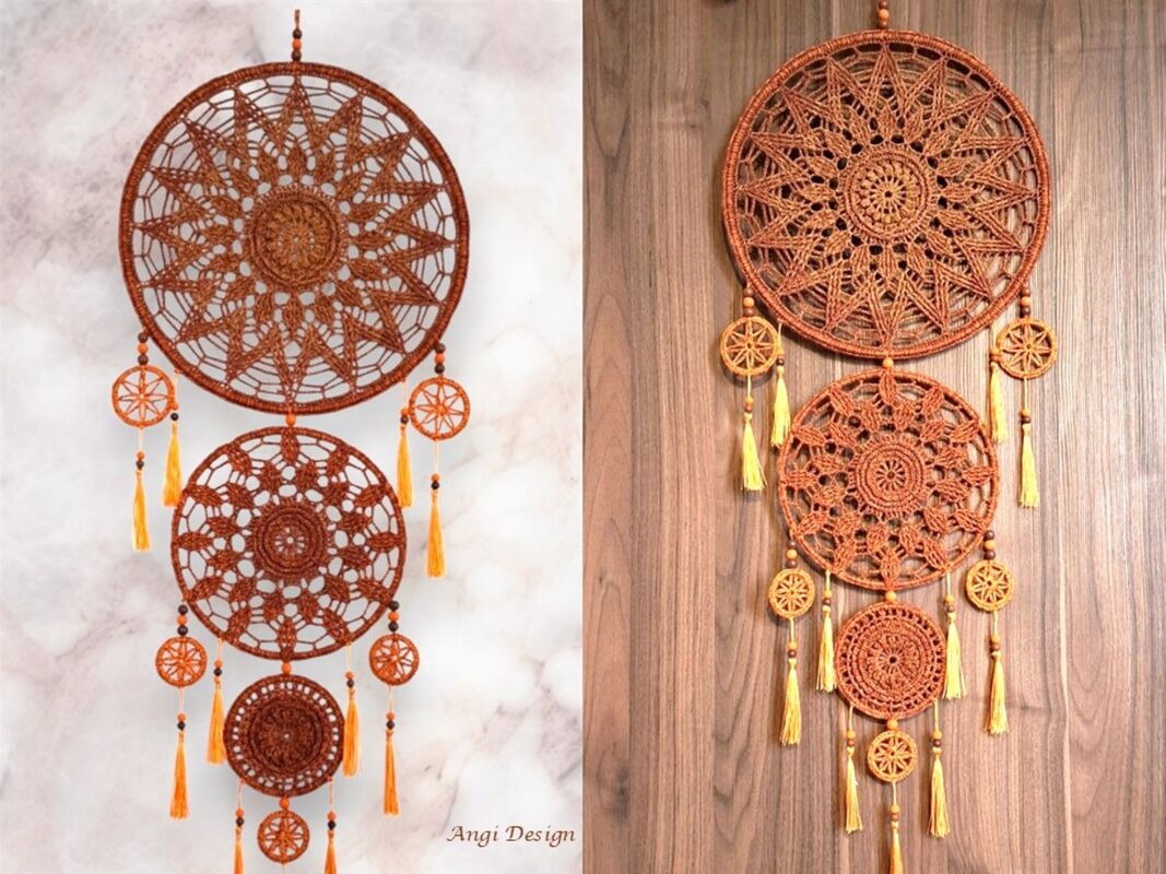 Dieser elegante Traumfänger wird auf Ringe gehäkelt.