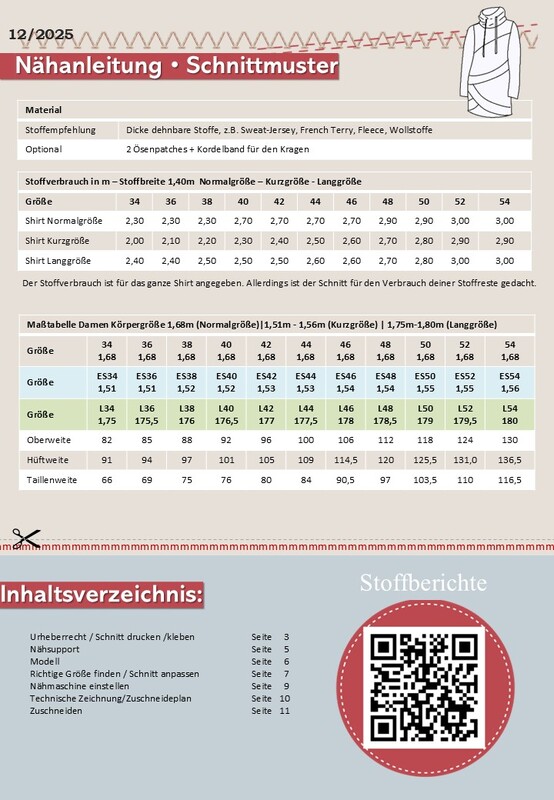 With its relaxed fit and mid-thigh length, Lani is perfect for everyday wear – comfortable with jeans, leggings or slim-fit trousers. A cosy stand-up collar (optionally with eyelet patches and faux cord) completes the look. Short video sequences in the instructions guide you step by step – ideal if you only have short periods of time for sewing. ️