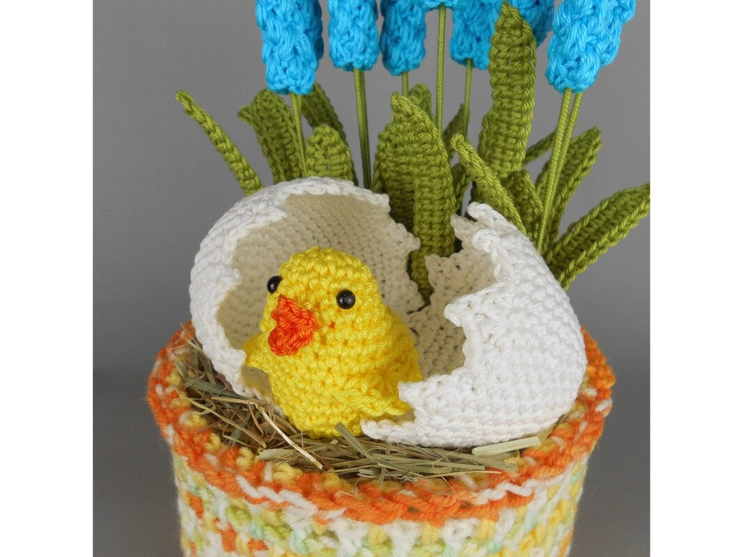 This crochet pattern lets you create an especially sweet spring decoration: a tiny chick just hatching from its egg, beautifully displayed in a crocheted flower pot with a woven basket look.