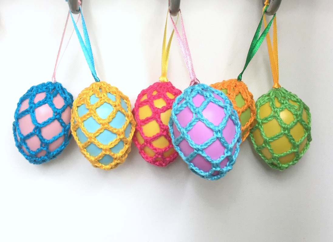 May I introduce: Colorful plastic eggs in a contrasting crochet mesh dress - an extremely unusual Easter decoration!