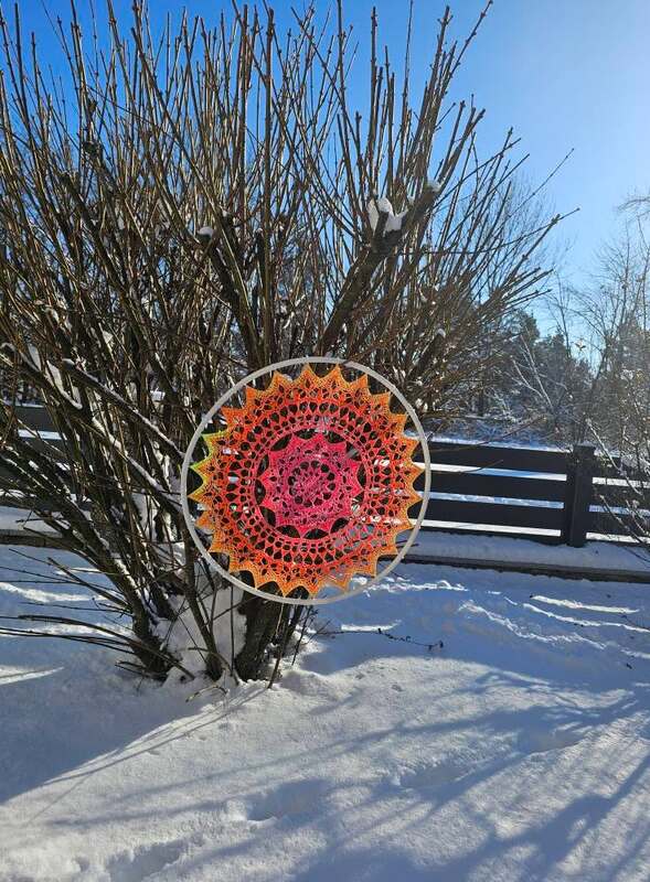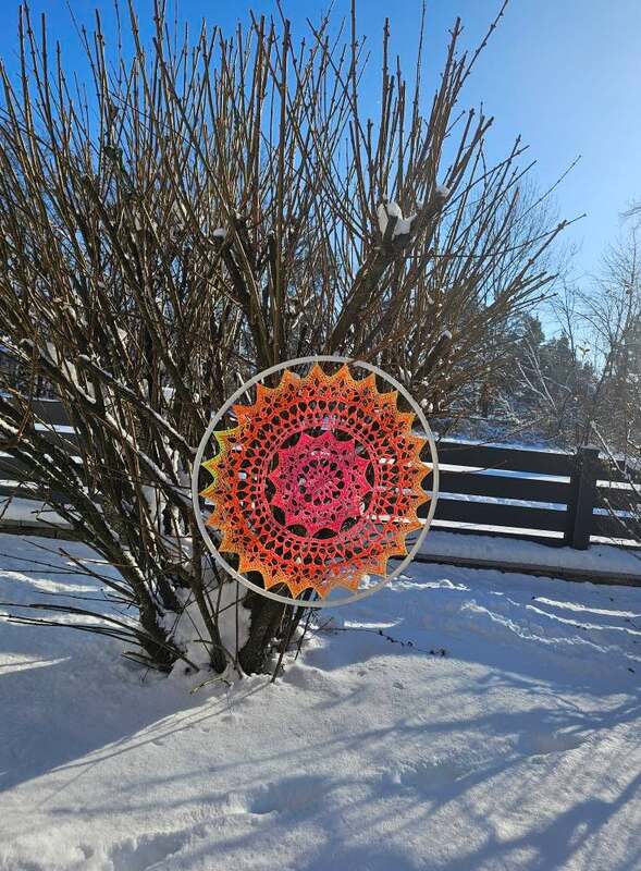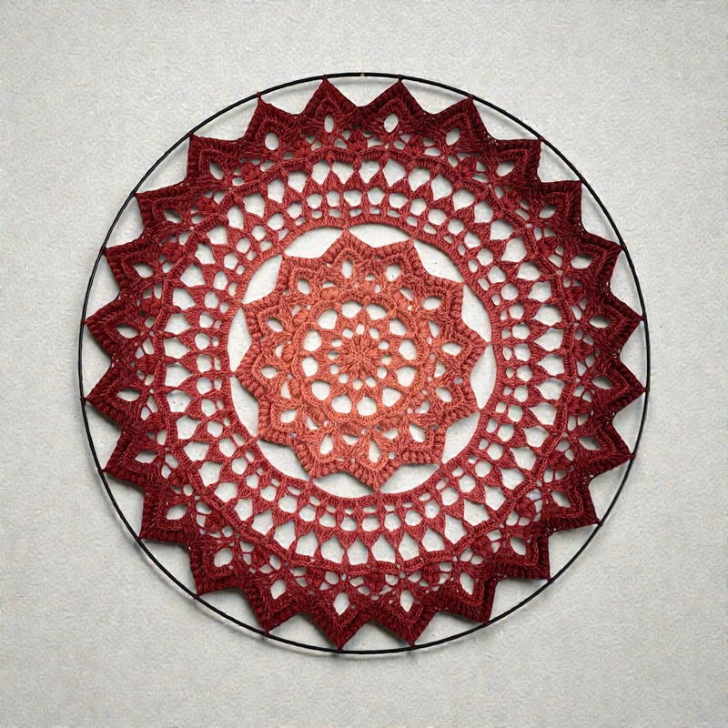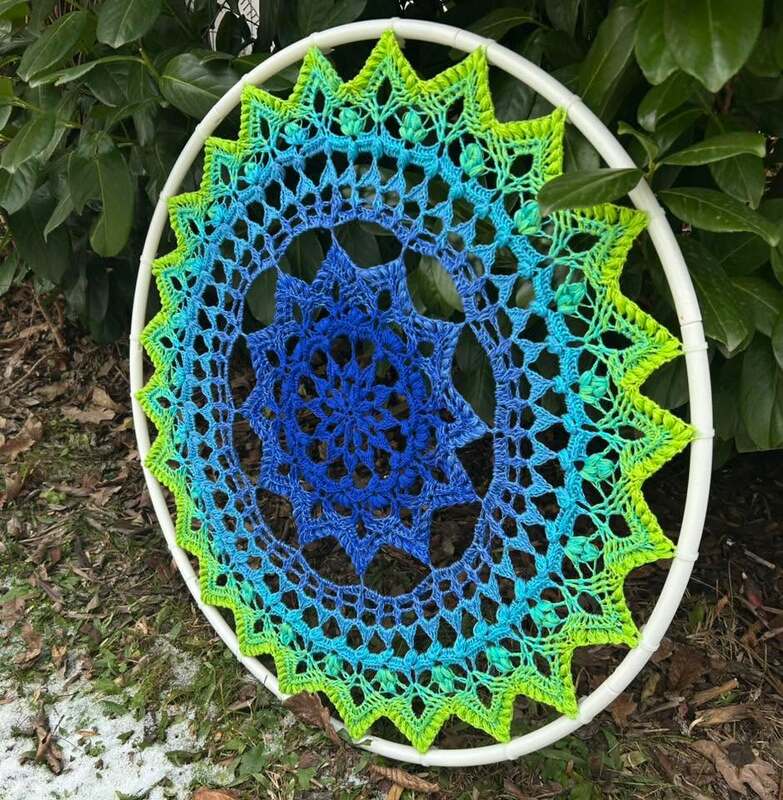 Phaedra—a gorgeous mandala that can be crocheted in two sizes. Perfect for using up leftover yarn or smaller balls, it's an eye-catching addition to any home!