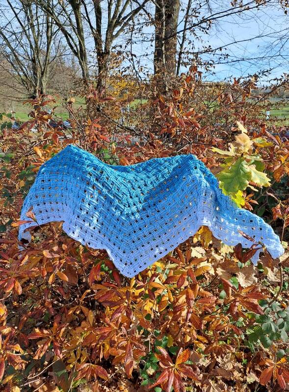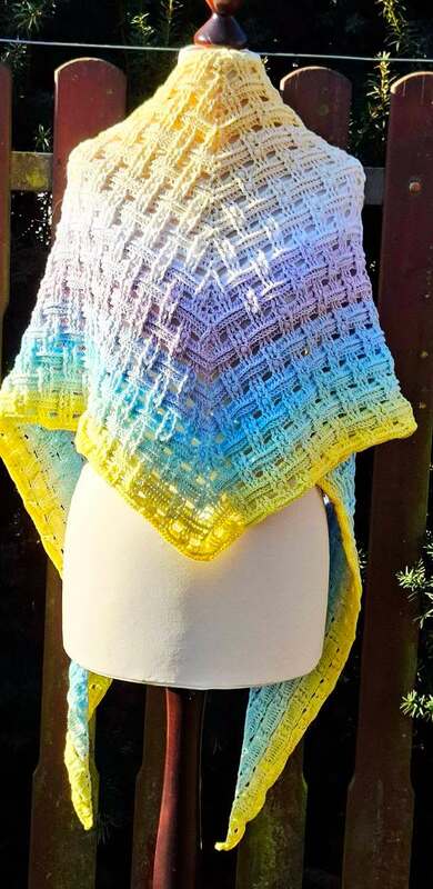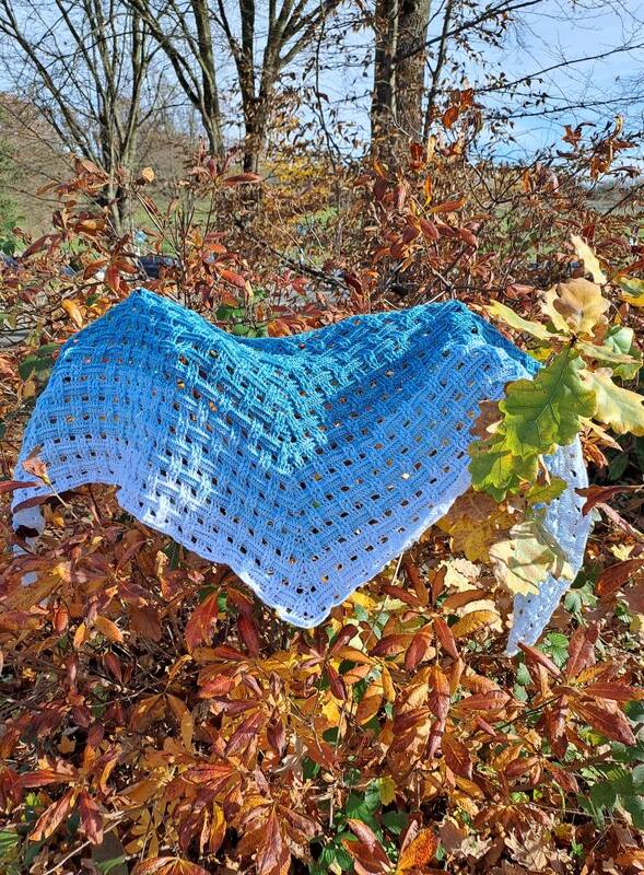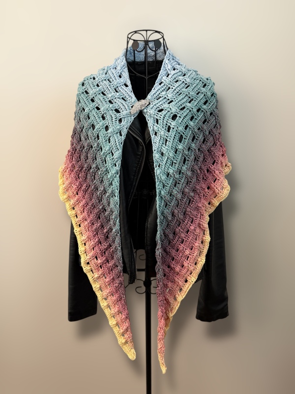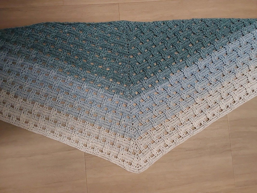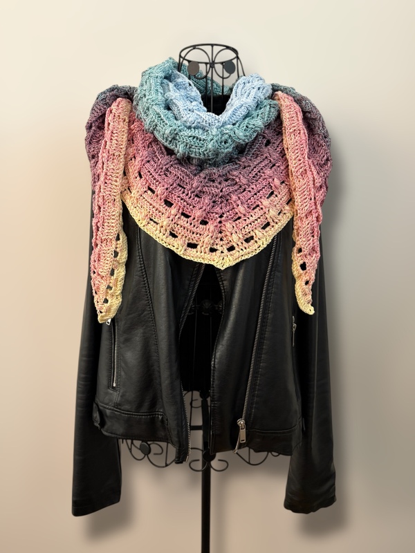The enchanting shawl Diopatra is a flat shawl with a beautiful braided pattern. Loose and airy, playful with tufted stitches, crochetable in any size—a companion for every season!
