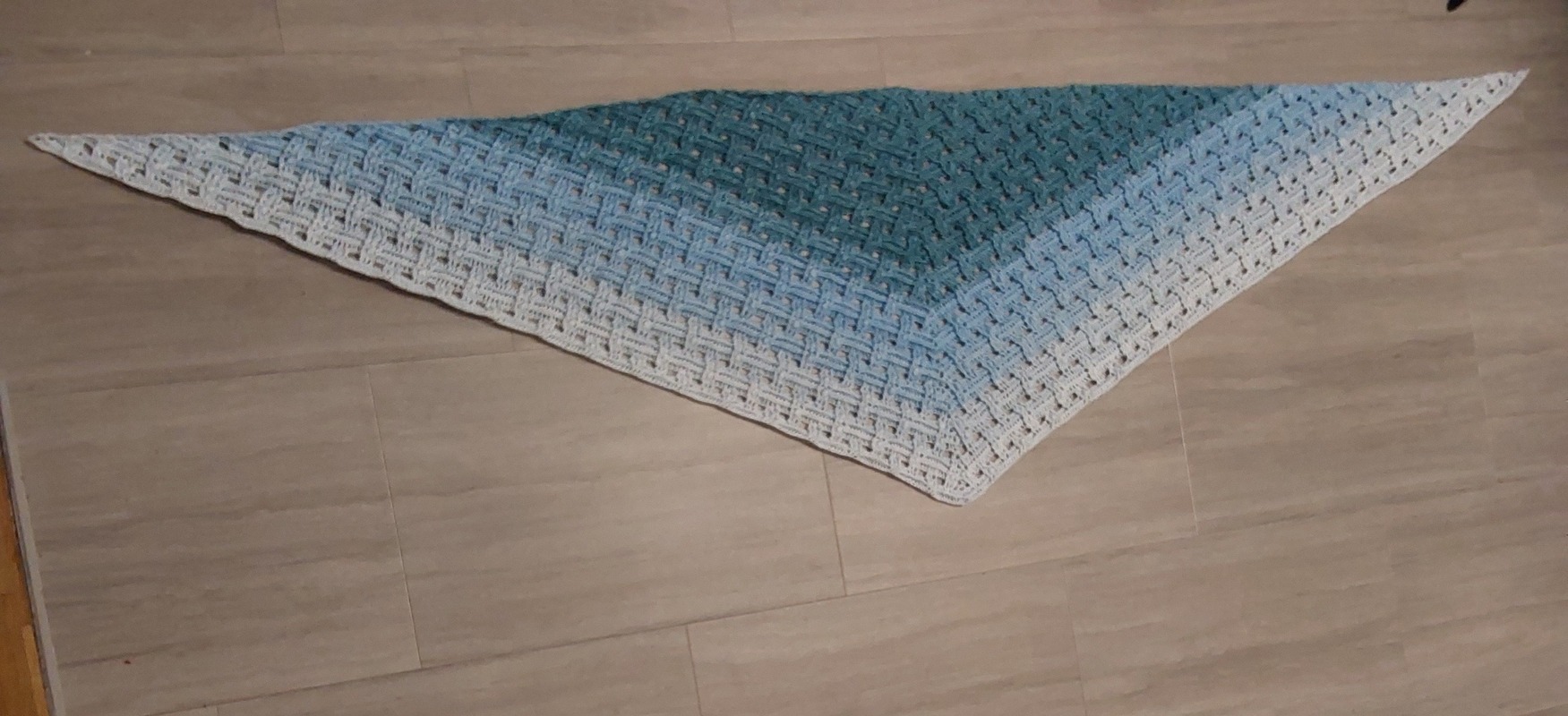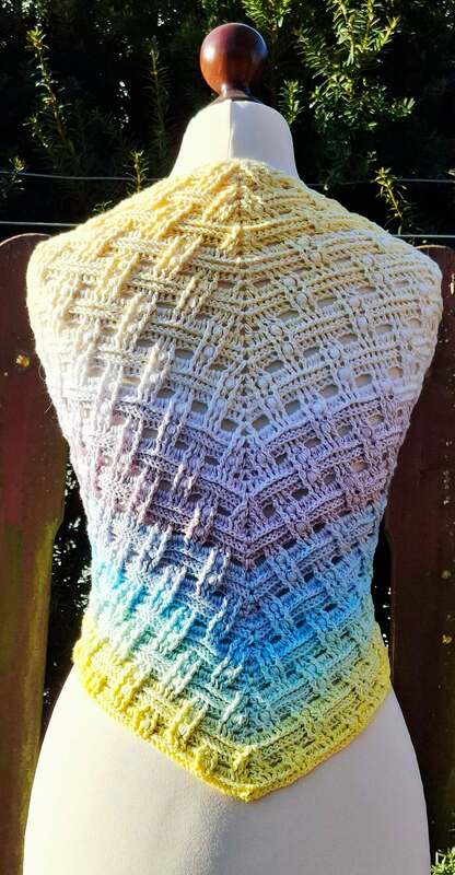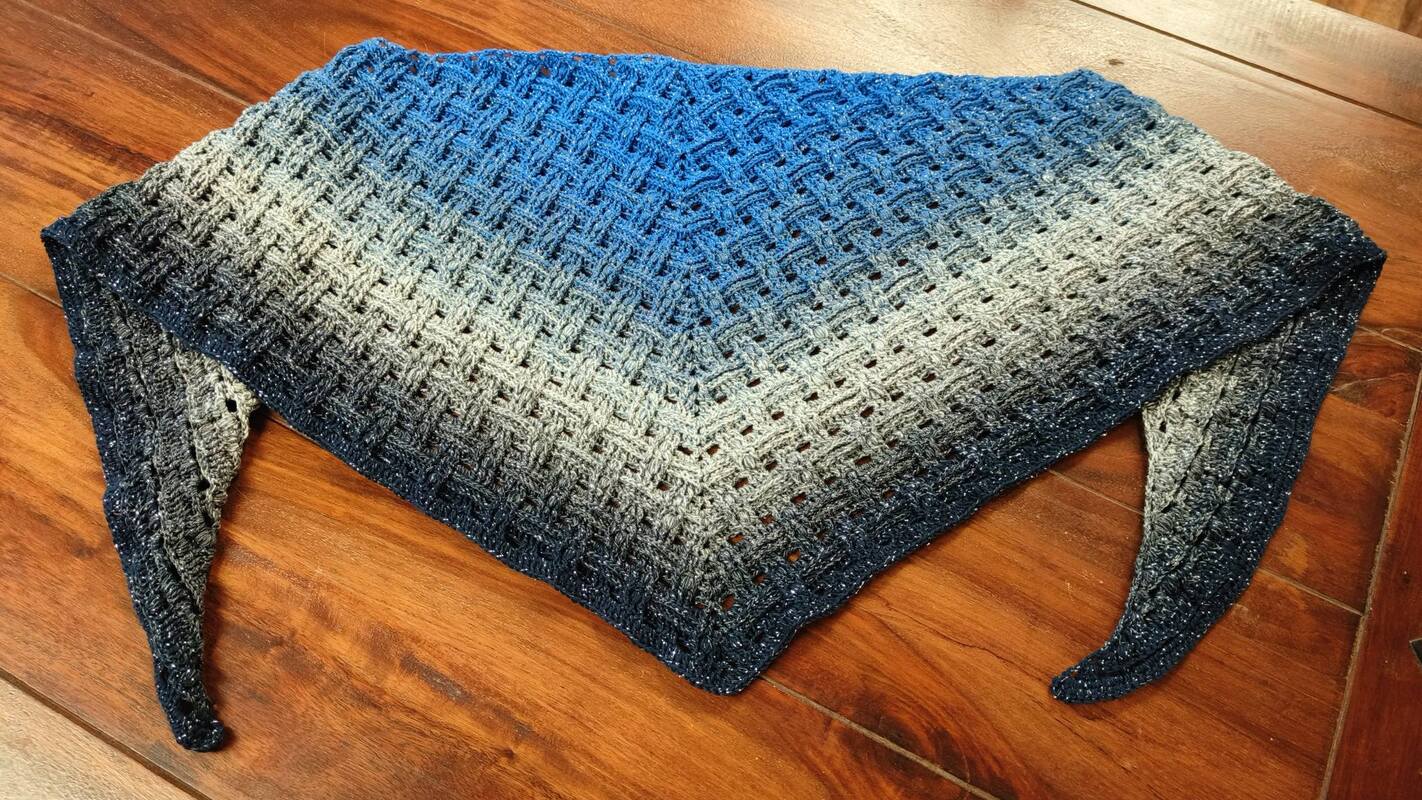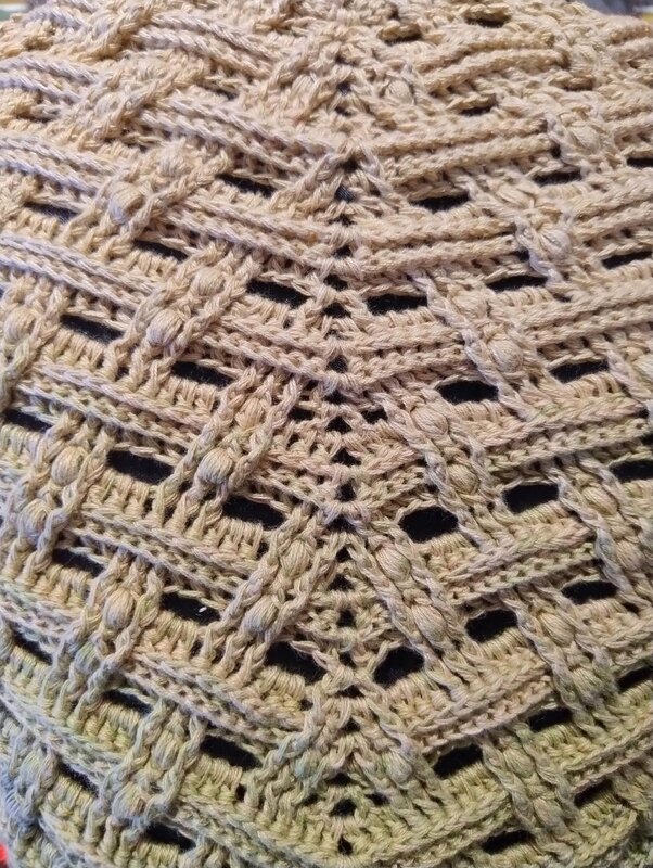 The enchanting shawl Diopatra is a flat shawl with a beautiful braided pattern. Loose and airy, playful with tufted stitches, crochetable in any size—a companion for every season!