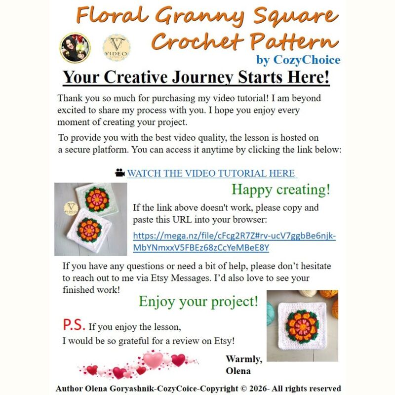 The finished granny square size is about 6.30 inches / 16 cm.