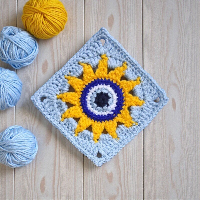 This eye granny square pattern is inspired by the powerful symbol of the evil eye square and the warm energy of a sun granny square .