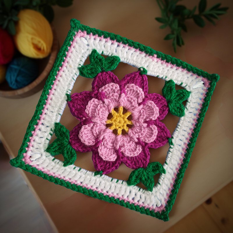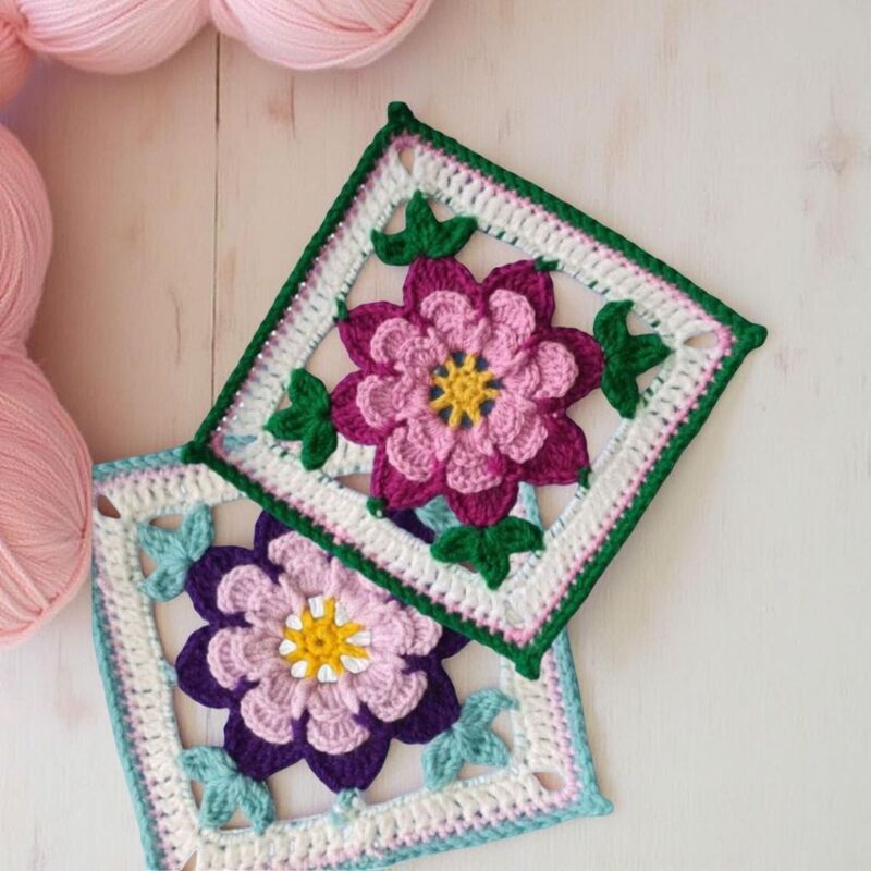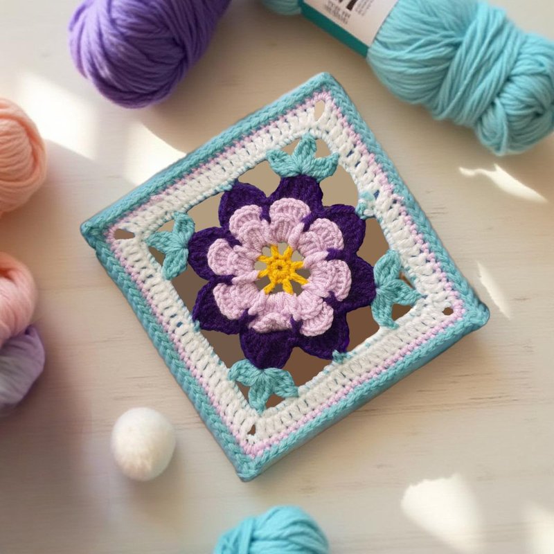 This cute crochet pattern is perfect for makers who love a frangipani square style, soft textures, and a bright floral granny square with a colorful mandala center