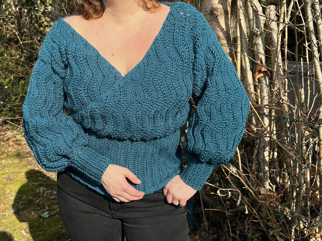The combination of a deep wrap neckline, dramatic balloon sleeves and the all-over sculptural wave pattern make this top an absolute eye-catcher. It's the perfect mix of feminine chic and handcrafted texture.