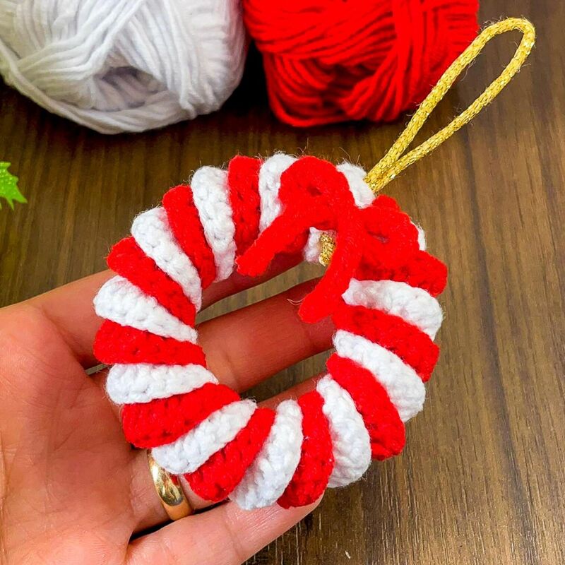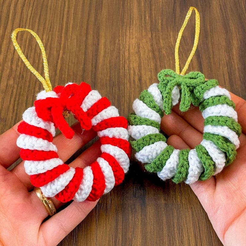 Create a festive Candy Cane Wreath Ornament with this crochet PDF pattern. This cute striped mini wreath features a classic red-and-white candy cane look and is finished with a small bow and hanging loop, making it perfect for Christmas decorating.