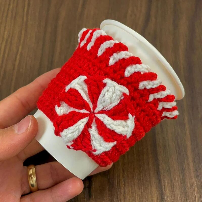 Create a festive holiday cup cozy with a charming peppermint swirl design using this crochet PDF pattern. This project is designed to fit a standard mug and features a two-color loop detail along the top edge, plus a decorative peppermint motif appliqué for a classic Christmas look.