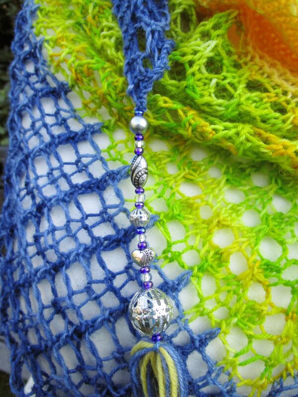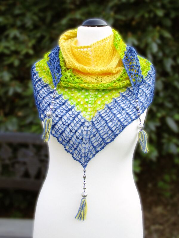 Sock yarn 4-ply (420m/100g): here: 17 g yellow, 35 g yellow/greenish, 26 g blue; circular needles 5 mm (US8), 1 stitch marker, 3 sets of beads