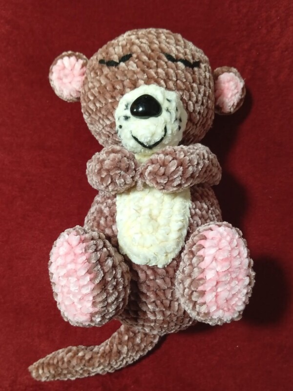 Using Chenille/Velvet yarn (super bulky) and a 3.5 mm hook, the otter will be approx. 24 cm (9.5 inches) tall.