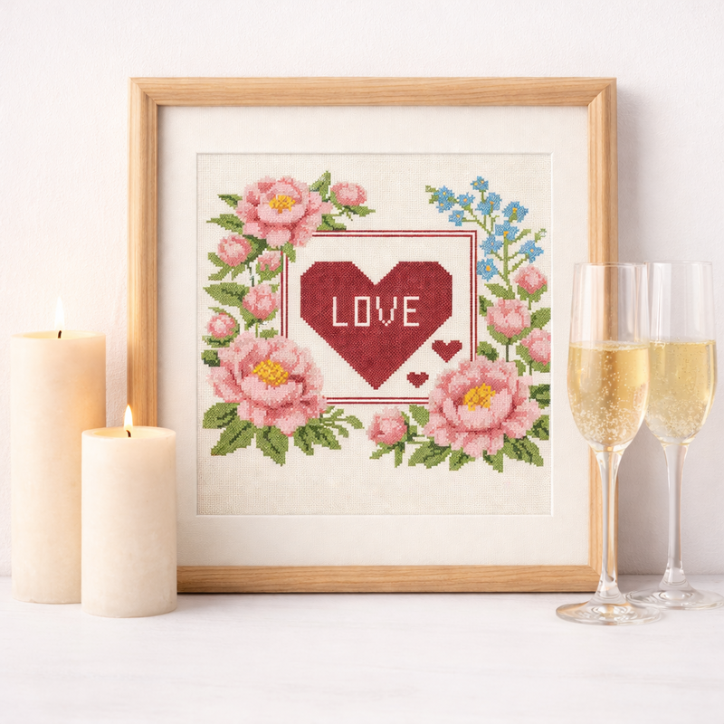 This romantic cross stitch pattern features a bold red heart with the word LOVE, surrounded by lush pink peonies, delicate blue flowers, and rich green foliage. The elegant square frame creates a balanced floral composition in a soft pastel color palette.