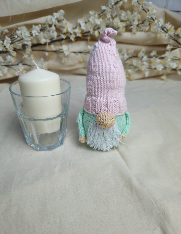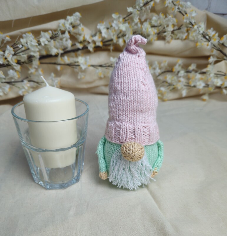 The gnome is knitted in separate pieces and then sewn together. This creates the charming effect of the eyes disappearing under the hat.