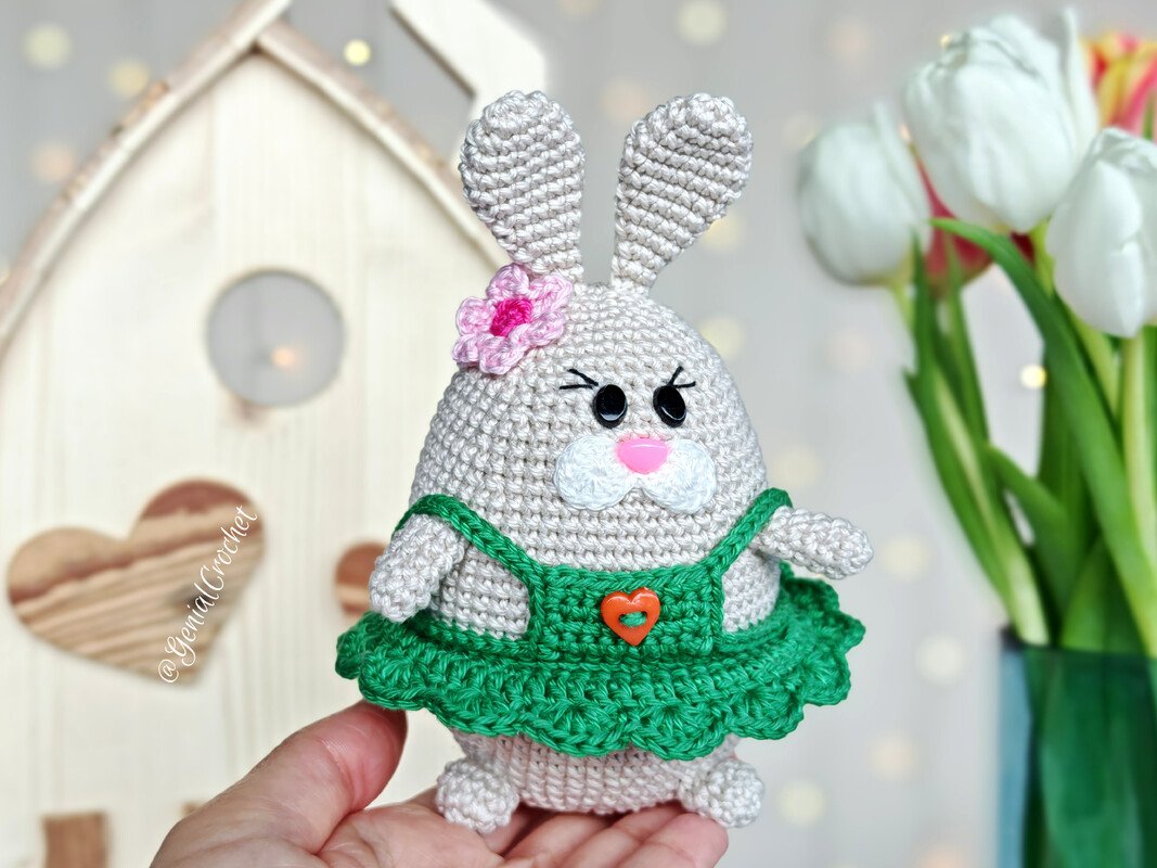 The bunny and dress are crocheted as one piece. The limbs are joined to the body with single crochet stitches while crocheting. A basket with crochet eggs and a tiny chick complete this charming Easter decoration.