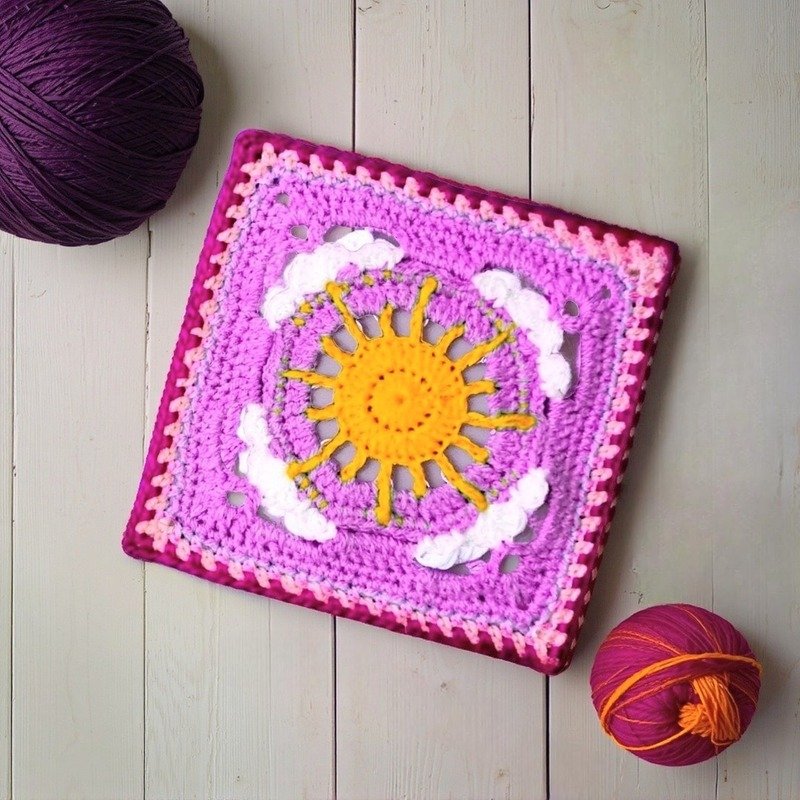 This sun granny square with a sweet crochet cloud design is a cute crochet pattern perfect for bright spring home decor and cheerful summer style projects ️️.