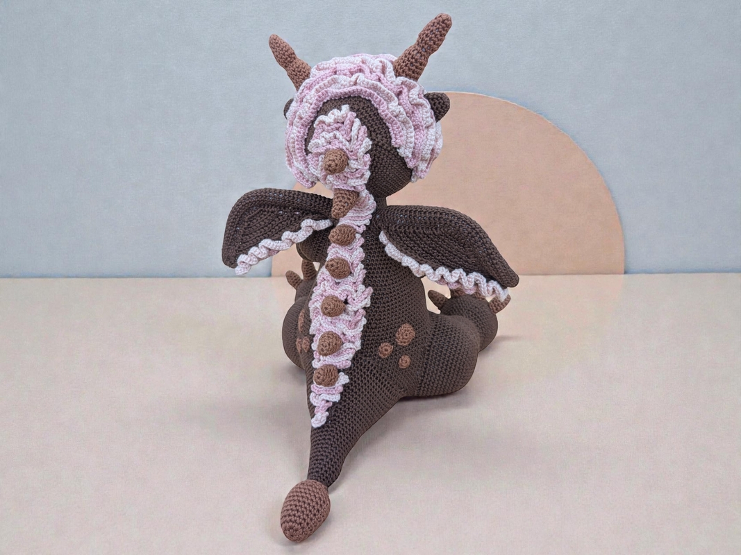 The finished dragon will be about 32cm. Of course, the size can vary depending on whether you crochet tight or loose. The choice of wool is also important.