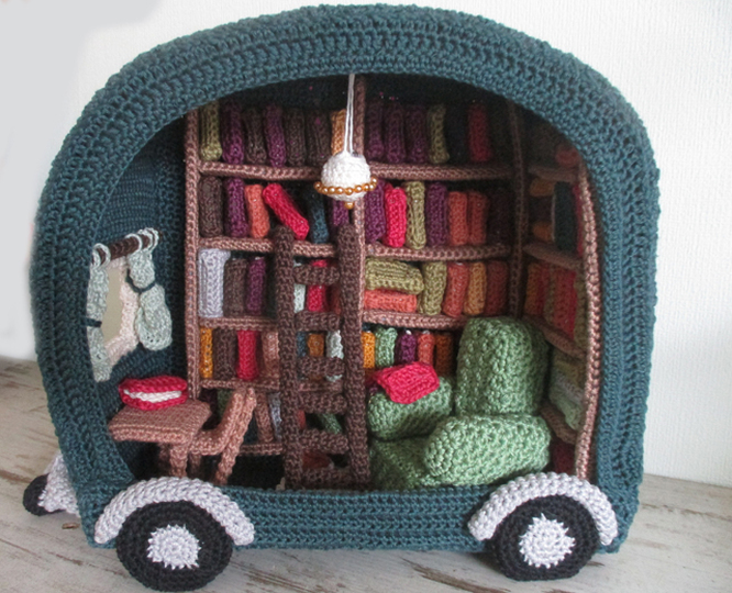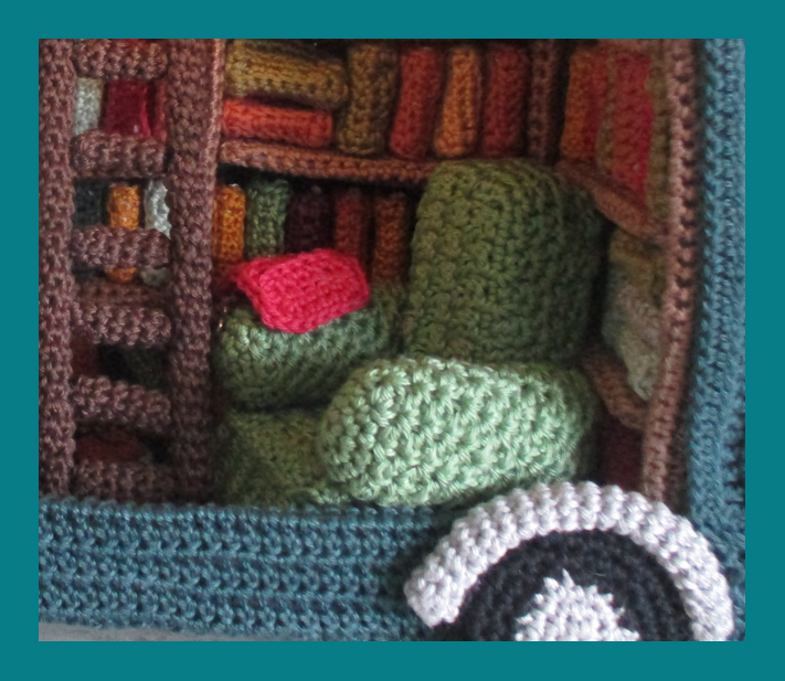 Cotton : 4 dark green, some cream-white, 1 light brown, some black, 1 gray, 1 white, various cotton scraps of your choice (for the books), 1 light green, 1 brown