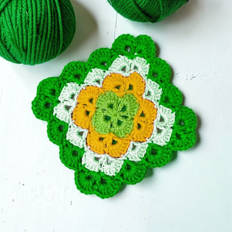 This lovely square has a classic floral feel and works beautifully in many projects. It looks delicate and textured, yet it is easy to repeat once you learn the rhythm. You can mix colors and create endless combinations. It is relaxing and satisfying to crochet.