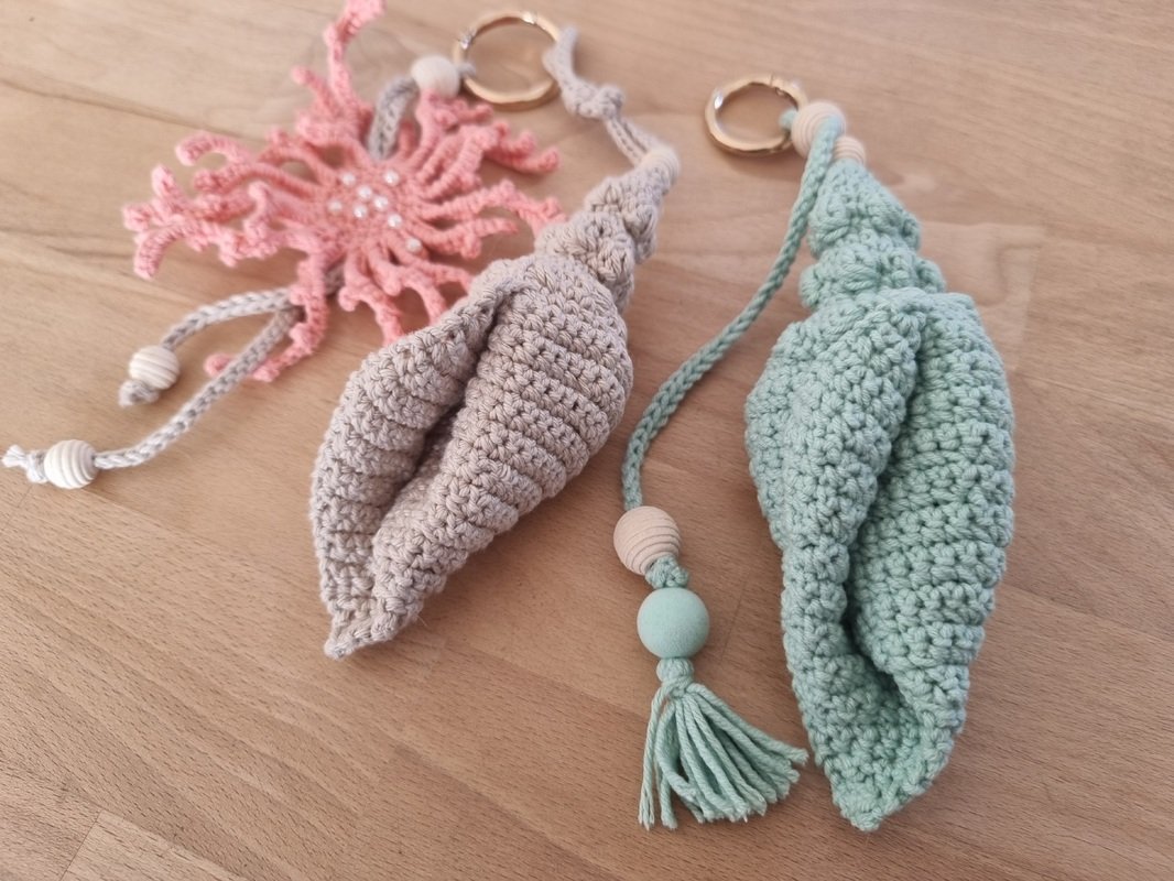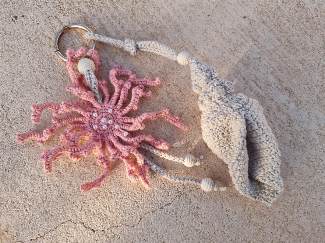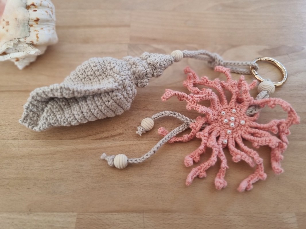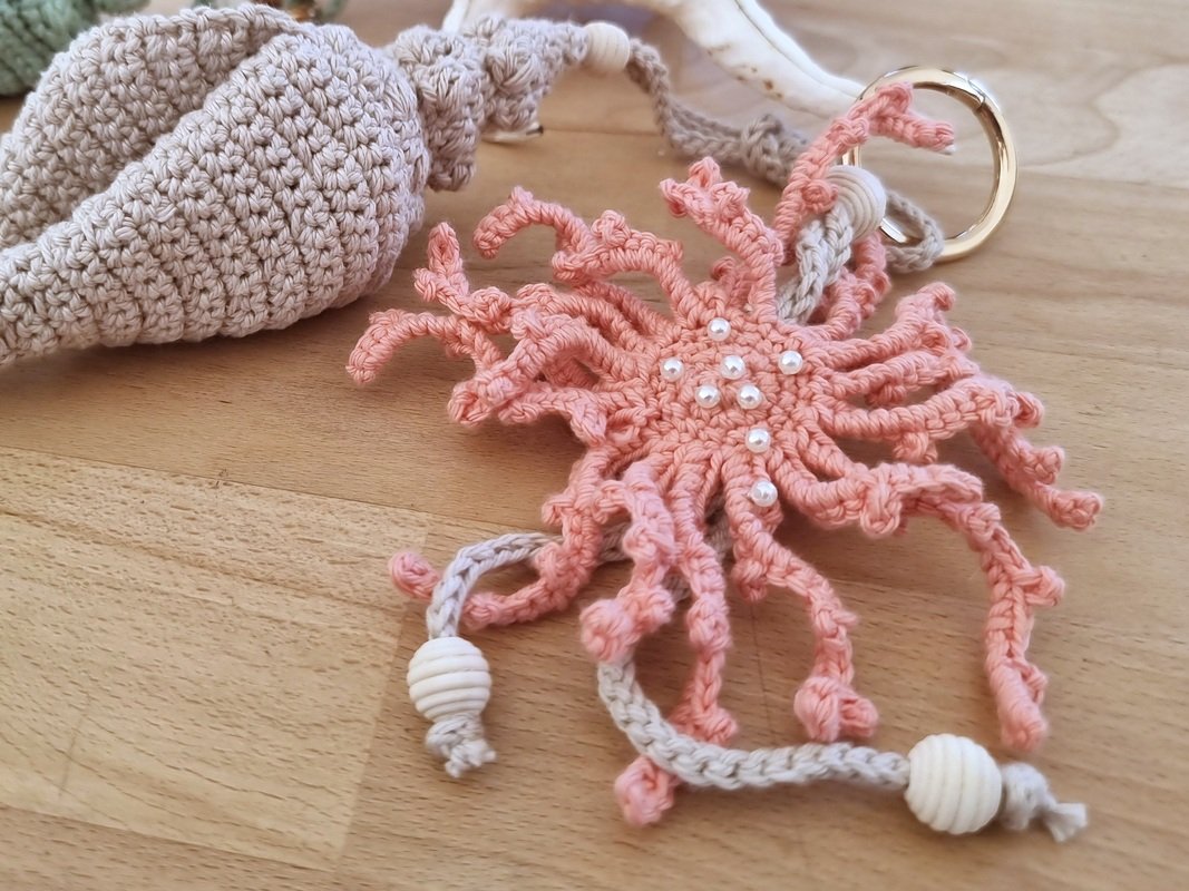 You will also need: 2 mm crochet hook, stitch marker, large hole beads for cord decoration, and small pearl beads for coral decoration.