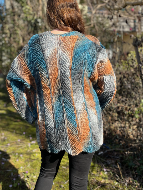 The highlight of this design is its flowing lines. The special crochet technique creates raised textures that, combined with a gradient yarn, unfold their full magic. Whether worn casually open or cinched at the waist with a tie belt, the "Dancing Leaves" Cardigan adapts perfectly to your figure.