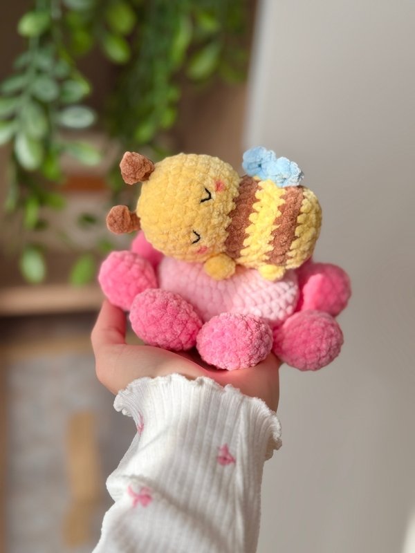 This amigurumi "bee on flower" crochet pattern shows how to make a small crochet bee on a flower using simple amigurumi techniques. The cute bee amigurumi sits gently on the petals, like a tiny spring crochet bee that has just landed on a blooming flower. This bee crochet pattern is a charming project for anyone who enjoys making amigurumi animals, crochet bees, and flower crochet toys. No sew!