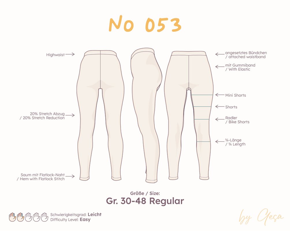 This pattern is intentionally straightforward: a classic high-waist leggings with attached waistband, perfect for everyday wear and super comfortable. Thanks to the uncomplicated construction, it’s also ideal for anyone just getting started with sewing jersey fabrics. And once you’ve made one, you’ll probably want a few more – because you can never have too many leggings.
