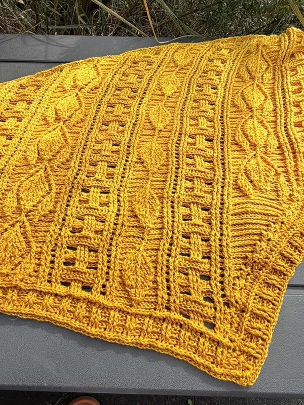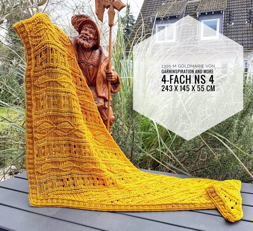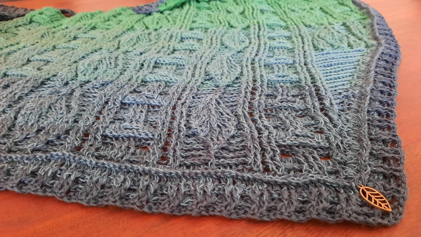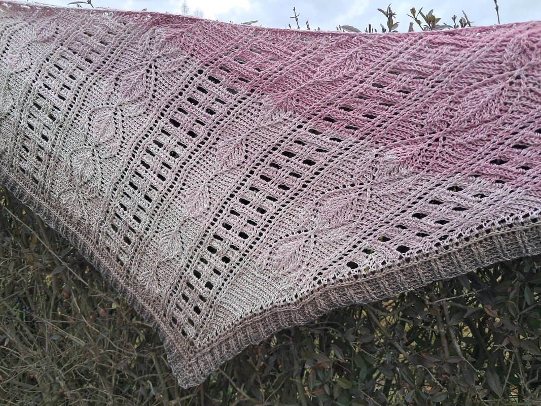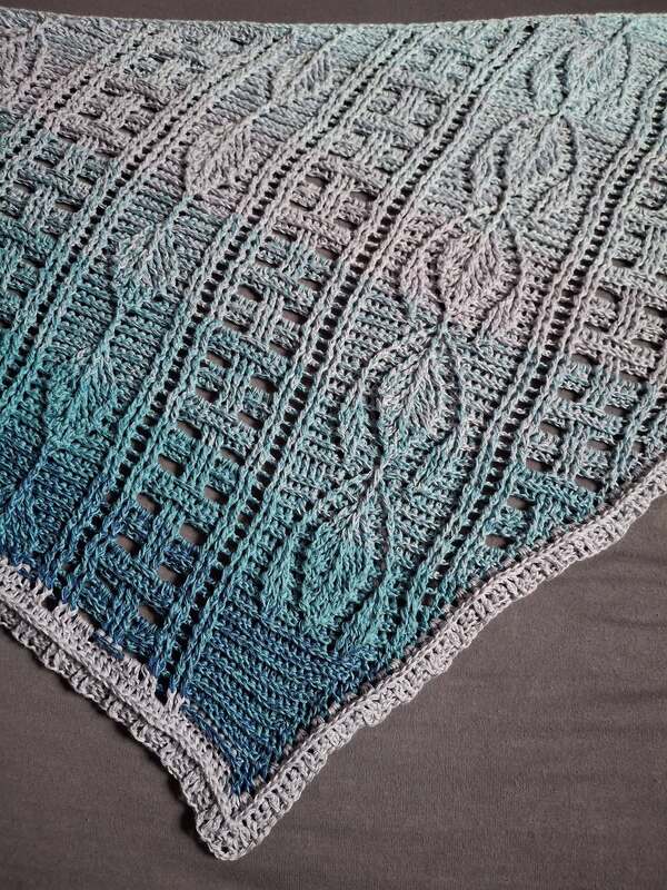 Playful leaf tendrils, an enchanting braided pattern—a beautiful, asymmetrical shawl: that's Larisaia!