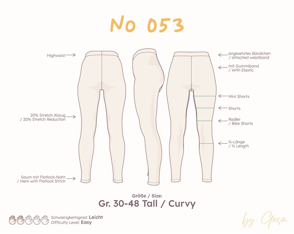 This pattern is intentionally straightforward: a classic high-waist leggings with attached waistband, perfect for everyday wear and super comfortable. Thanks to the uncomplicated construction, it’s also ideal for anyone just getting started with sewing jersey fabrics. And once you’ve made one, you’ll probably want a few more – because you can never have too many leggings.