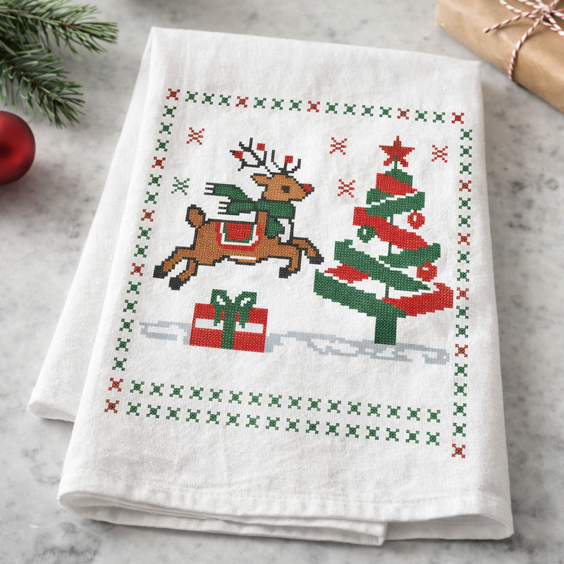 Celebrate the warmth of the holiday season with this charming Christmas cross stitch design featuring a joyful reindeer leaping beside a decorated Christmas tree and a festive gift.