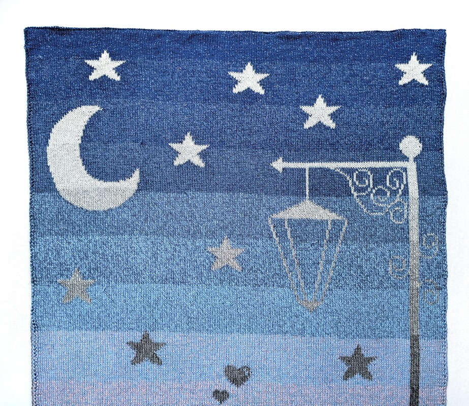 With this gauge, size of the finished blanket will be approx. 72 cm x 97 cm (extended version approx. 72 x 104 cm). The pictures show the extended version. In the standard / smaller size, the blanket ends below the top three stars.
