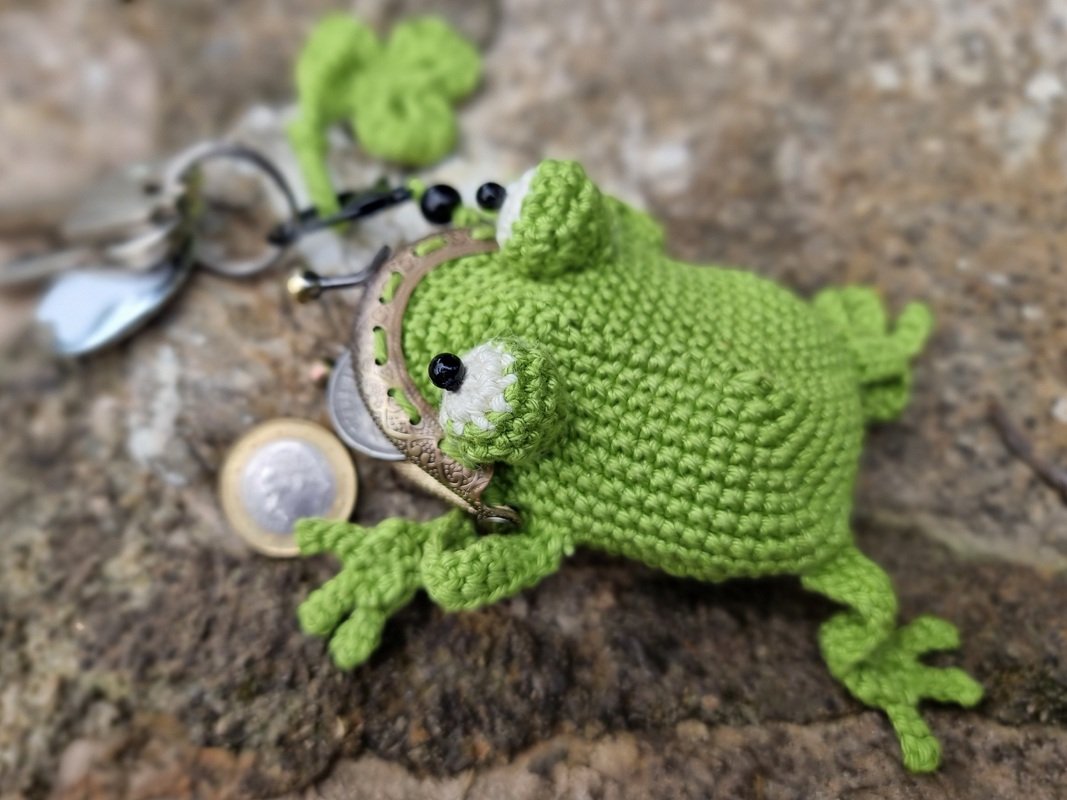 Crochet this small frog with a clover leaf that can serve several functions. It can be used as a coin purse, a keychain, or a bag charm. It can also be a nice gift for your friends and family. The frog has always been considered a talisman that brings money.