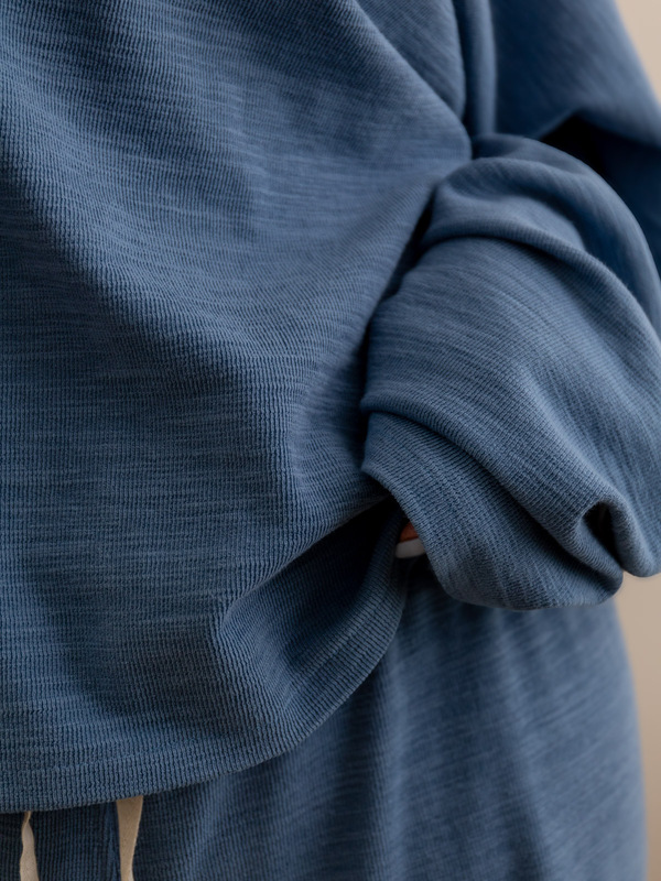 Sew it in jersey. Since the fit is oversized, the fabric does not have to be extremely stretchy. What matters most is how it feels against your skin: choose a jersey that is soft, breathable, and simply comfortable.