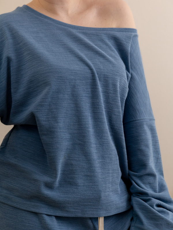 Sew it in jersey. Since the fit is oversized, the fabric does not have to be extremely stretchy. What matters most is how it feels against your skin: choose a jersey that is soft, breathable, and simply comfortable.