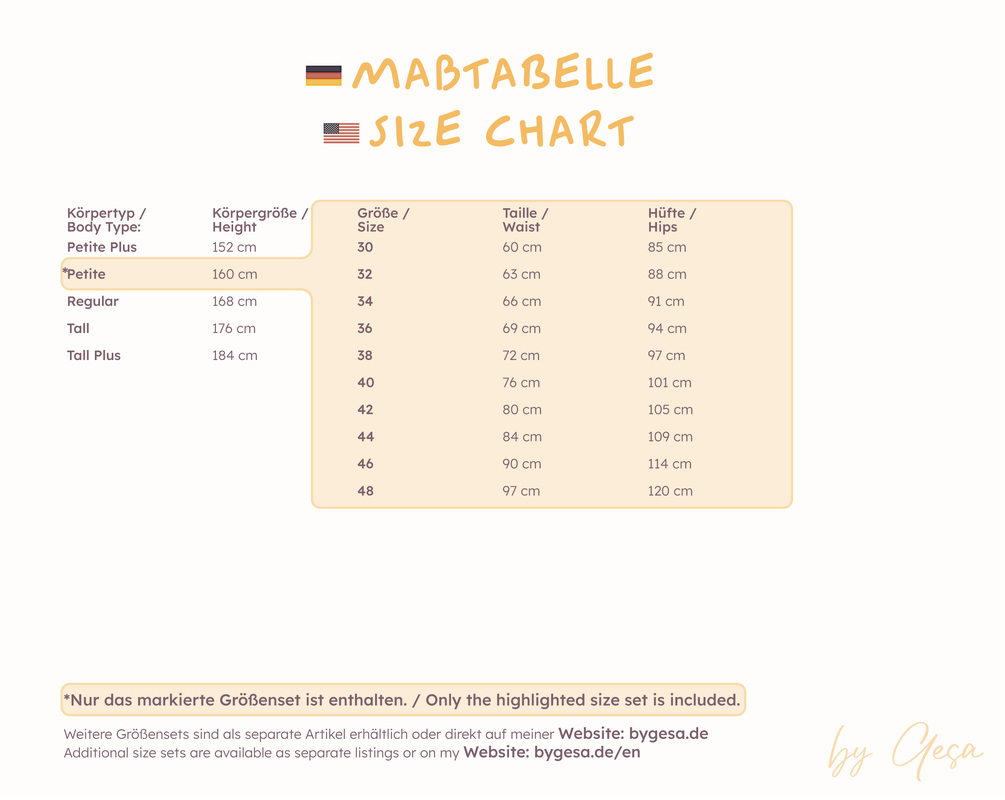 | Petite Plus | 152 cm | 30 | 60 cm | 85 cm |