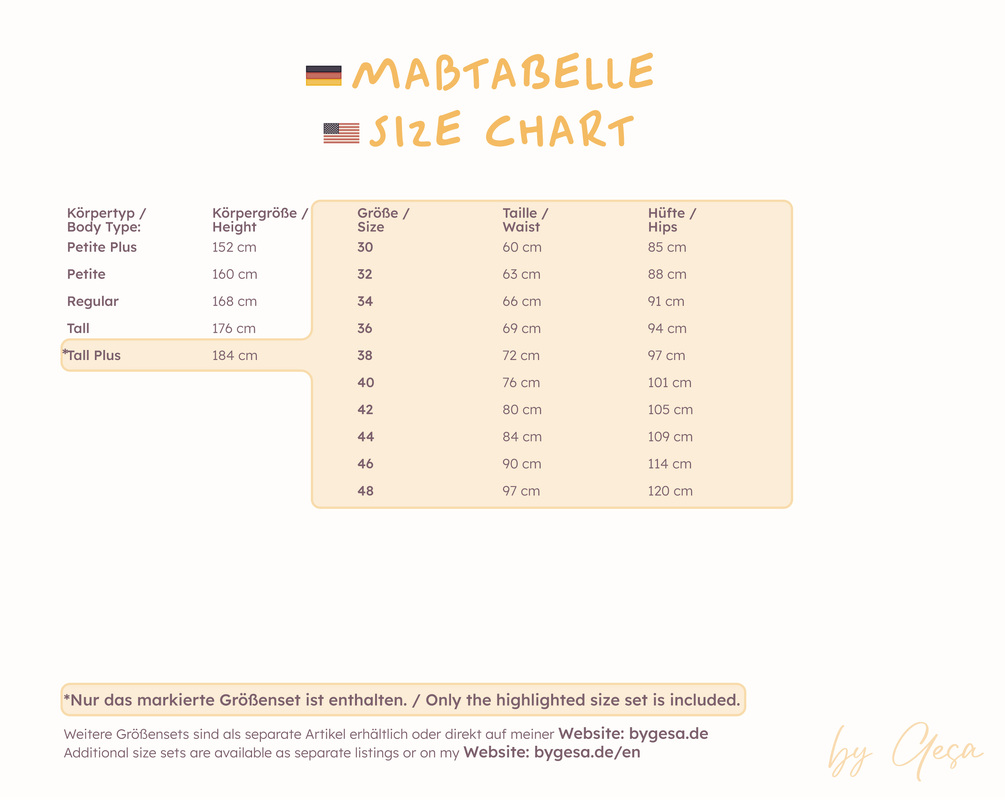 | Petite Plus | 152 cm | 30 | 60 cm | 85 cm |
